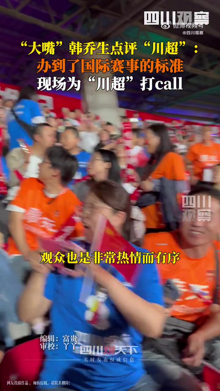 韩乔生说谈:“第一我以为便是赛事组织迥殊可以,治安井然,不雅众也口角常关爱有序,从球员入场到赛事组织,包括到草地的灯光草坪,所有这个词四川在大型赛事的组织智商可以说达到了海外赛事的尺度。川超雄起!中国雄起!”
