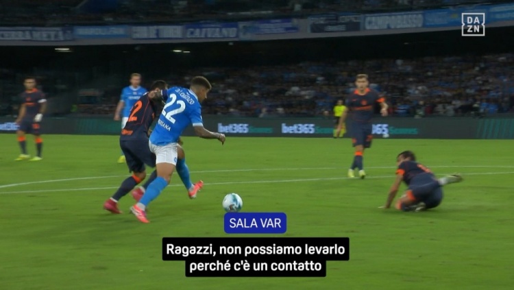 VAR: "确乎,迪洛伦佐有介入,但他介入是因为一个看成……他并不是为了争取不属于球的空间而伸腿,而是为了保护球而伸腿。咱们来看一下姆希塔良的看成,稍等。望望迪洛伦佐的脸,他正保护着球。稍等一下,我在核实。”