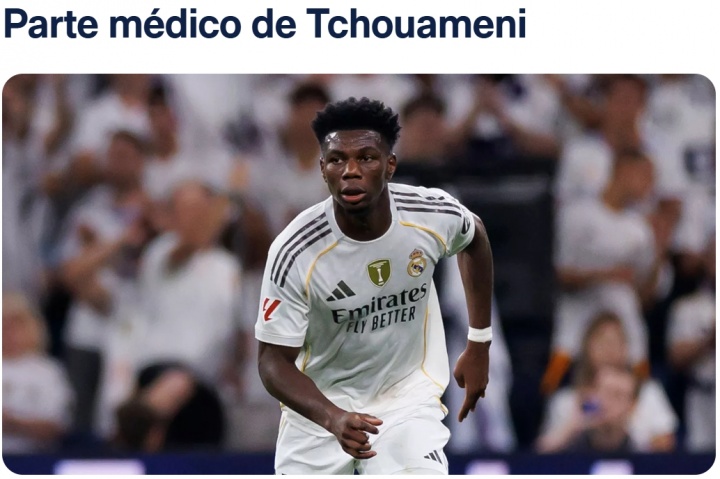 官方:皇马中场琼阿梅尼左腿半腱肌受伤,西媒预测伤缺三周