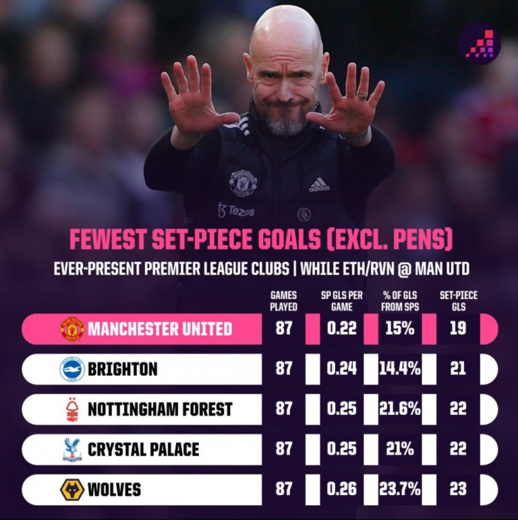 滕哈赫治下曼联87场英超定位球进球数仅为19球,本赛季13轮10球