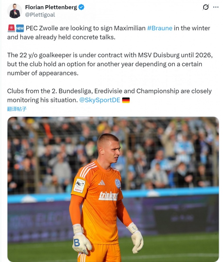记者:兹沃勒专门杜伊斯堡门将布劳内,德乙、英冠也有球队姿色他