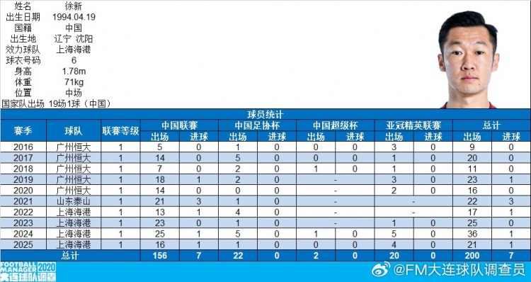 徐新完成中国俱乐部各项事业赛事出战200场,共打入7球