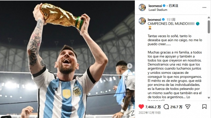 1-梅西社媒发文庆祝天下杯夺冠,7466.2万