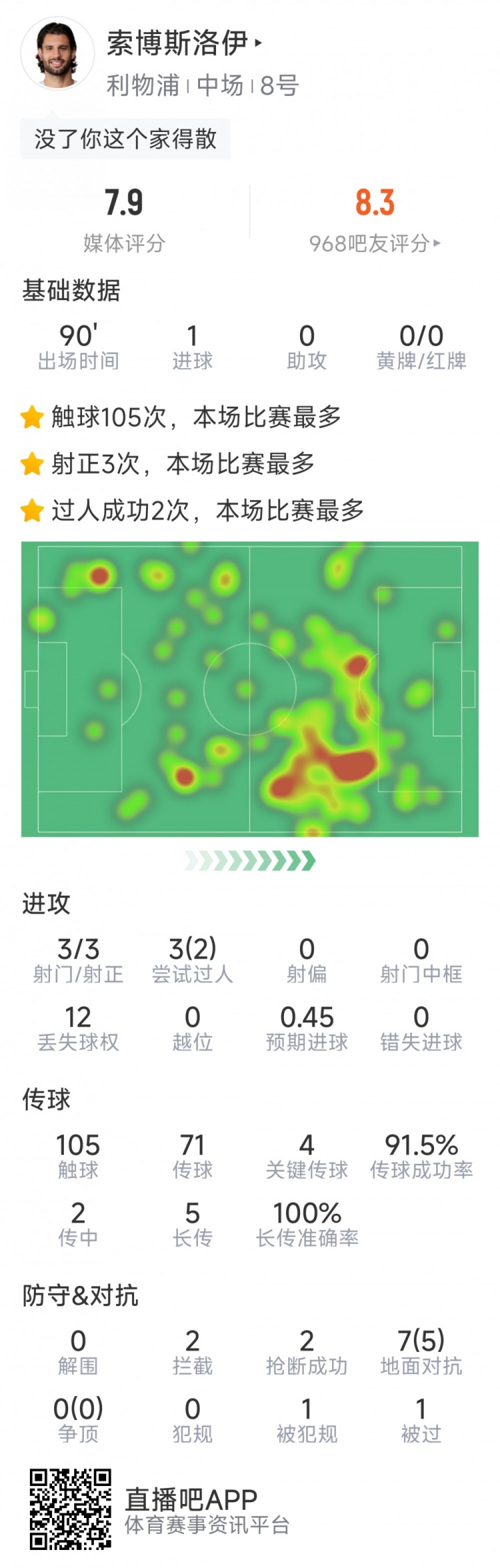 独一靠谱,索博本场数据:1进球,4重要传球,评分7.9分全队最高