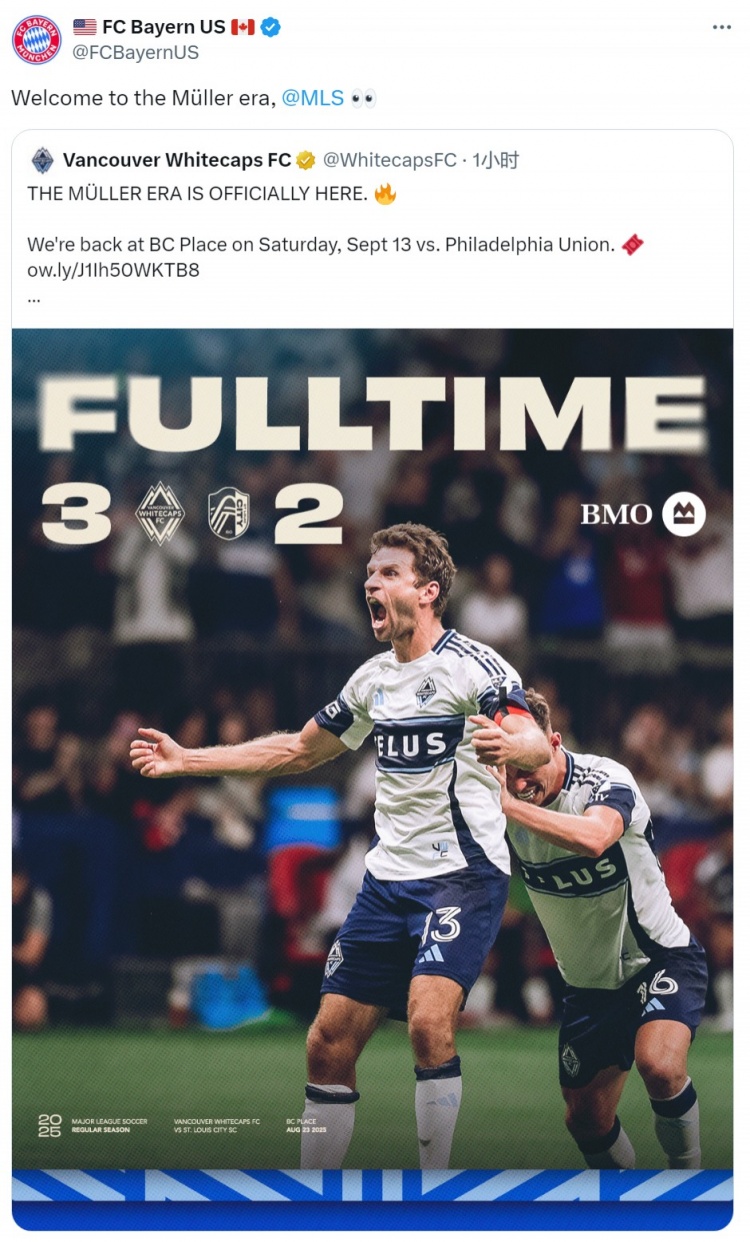 拜仁官方社媒转发温哥华白浪的海报,并@好意思职联,配文:“迎接来到穆勒期间。”