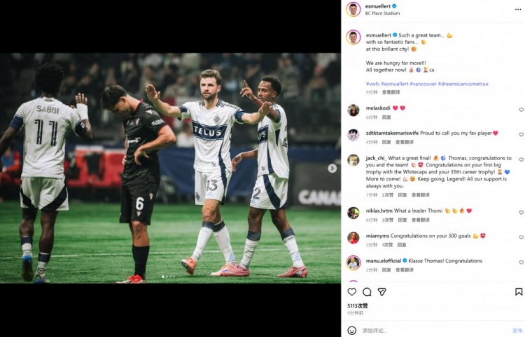点射破门助温哥华白浪夺冠,穆勒社媒晒照回来:咱们还渴慕更多!