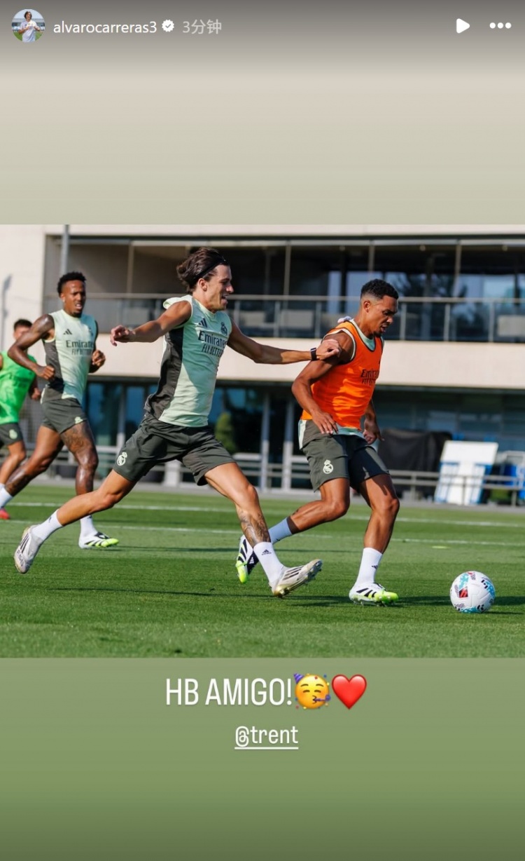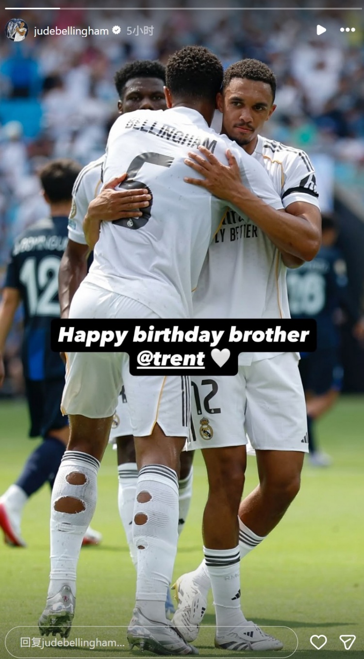 10月7日讯 今天是阿诺德27岁诞辰,皇骑兵友贝林厄姆、卡雷拉斯也纷纷在社媒晒出与阿诺德的合照为其奉上诞辰祝贺。