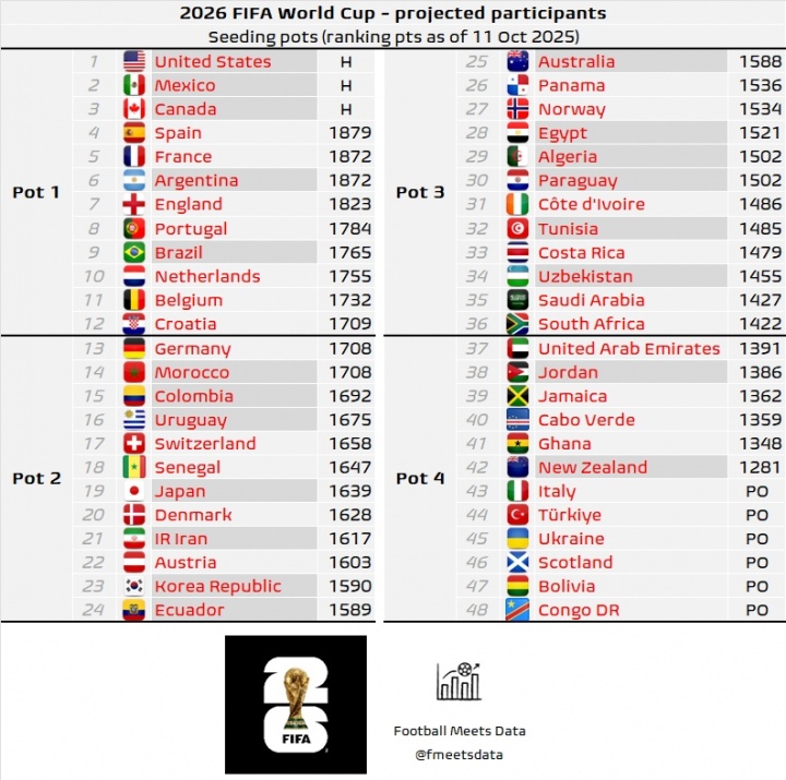 10月12日讯 正好10月海外比赛日,多个大洲的世初赛仍在进行中,2026宇宙杯已笃定了20个席位包摄,数据机构现在给出了宇宙杯分档的最新展望效力。
