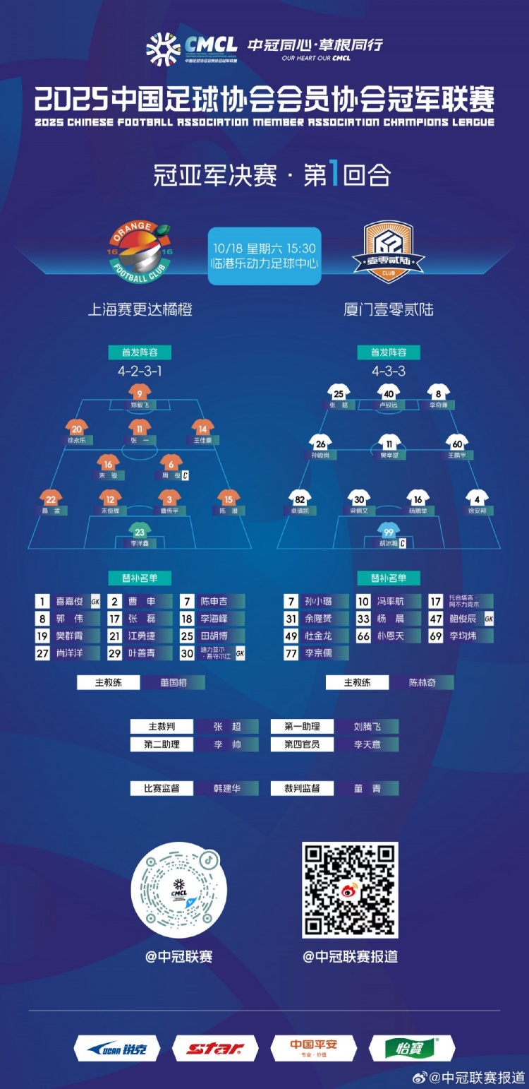 中冠决赛首回合名单公布,59岁投资东谈主朱骏代表上海赛更达橘橙首发
