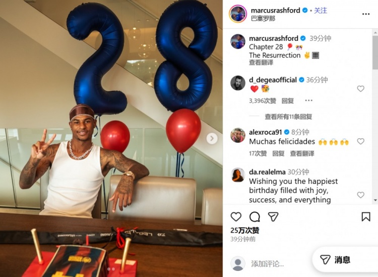 11月1日讯 10月31日是英格兰先锋拉什福德28岁生辰,在酬酢媒体上,这名被曼联外租至巴萨的弓手写说念:东说念主生第28章!荣达!
