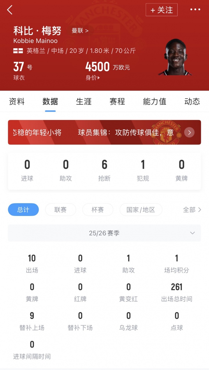 梅努本赛季代表曼联出战10场孝敬1次助攻,现在身价4500万欧