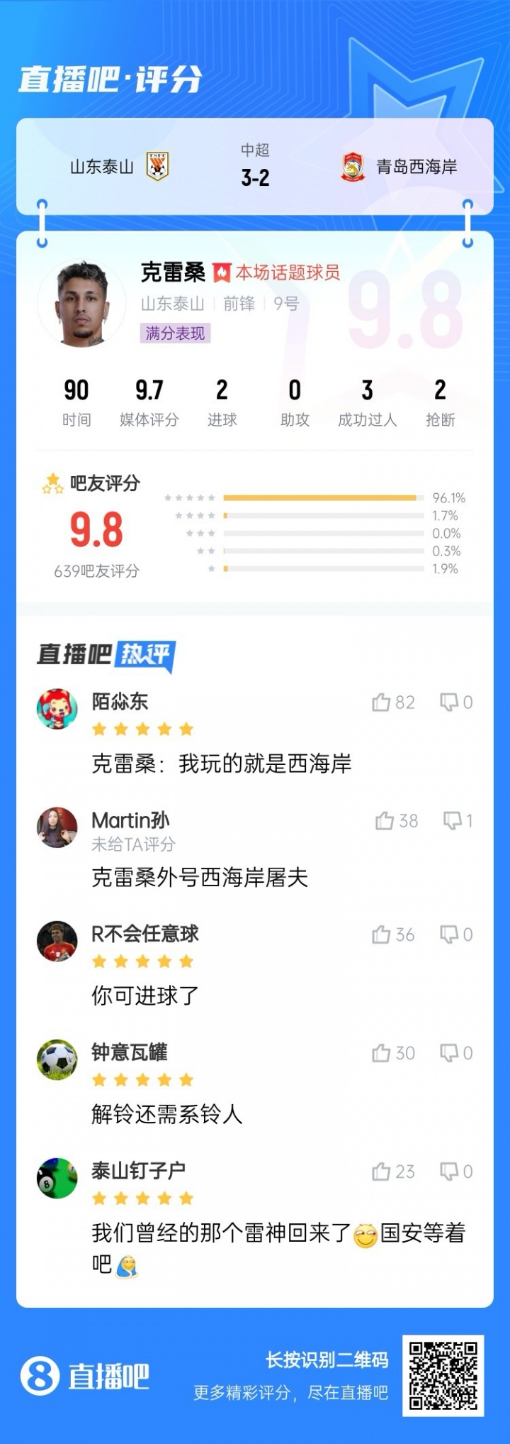 【】中超第22轮最好球员评比遵循出炉,克雷桑当选本轮最好!克雷桑在山东泰山与青岛西海岸比赛中猖狂球破门+双响,冲突个东谈主中超赛场4个多月球荒。克雷桑本赛季第三次得回评比中超当轮最好球员。