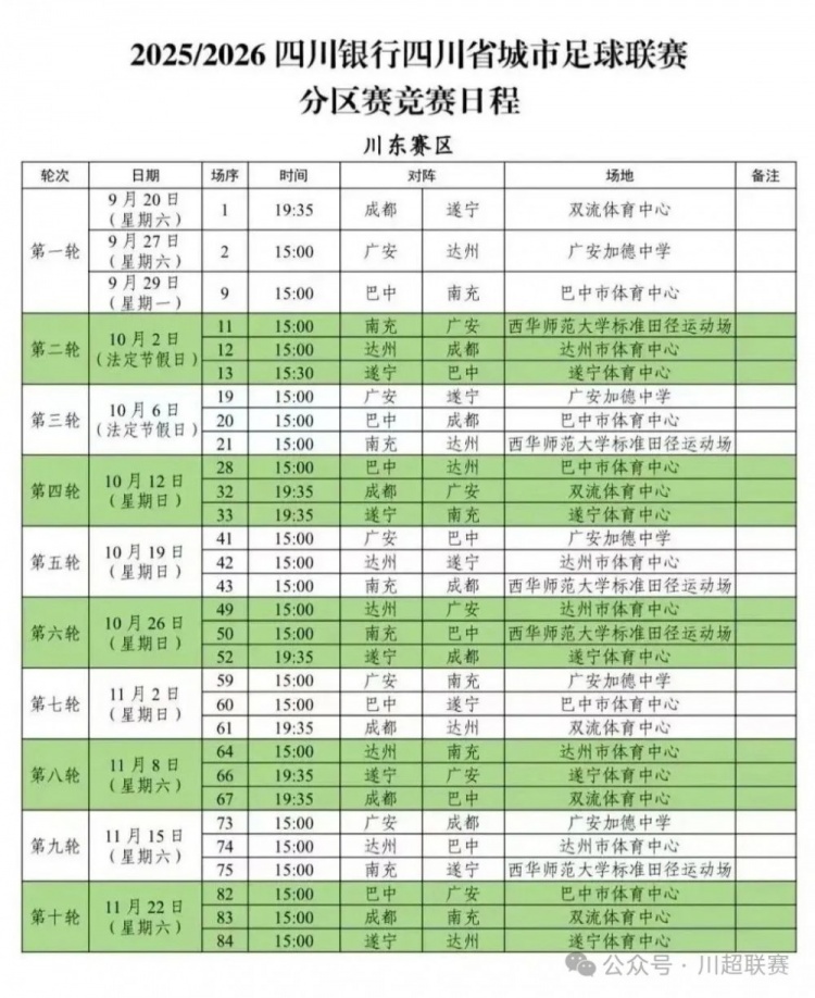 9月11日讯 四川省城市足球联赛官方公布了分区赛竞赛日程,成王人队将与遂宁队在9月20日晚上19:35分进行揭幕战。