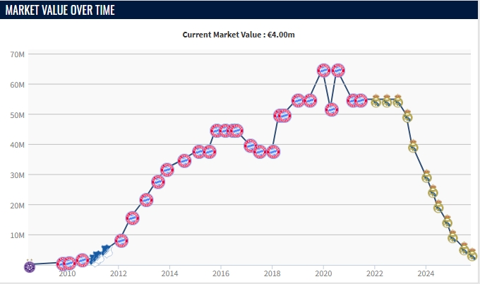 2021年夏窗阿拉巴与拜仁条约到期,随后解放身加盟皇马,29岁的他在皇马也夺得了不少冠军。30岁时阿拉巴身价尚有5500万欧,但受伤病影响,只是3年便降到只剩400万欧,跌回了伊始耀眼霍村之时的身价。