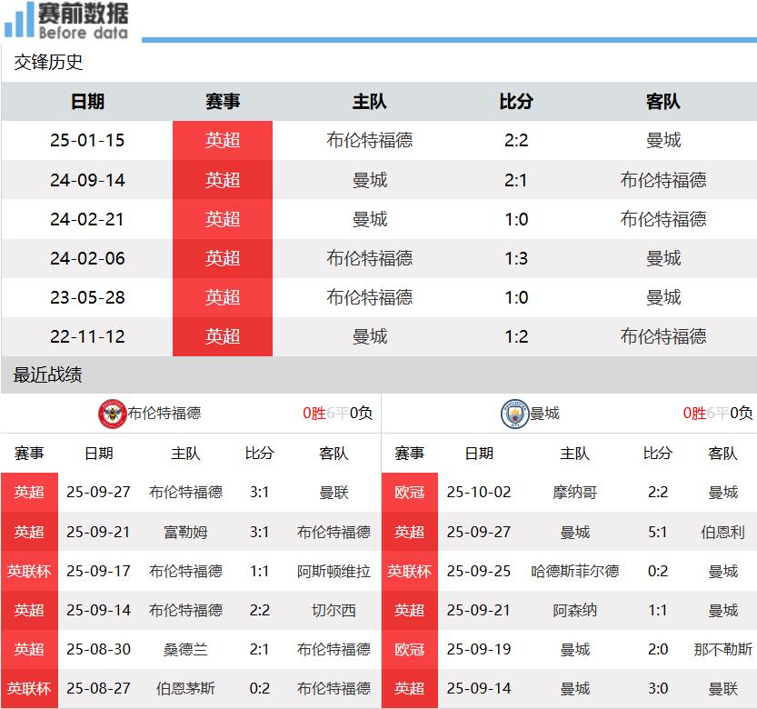 北京时辰10月5日晚上23:30,英超第7轮,布伦特福德主场迎战曼城。
