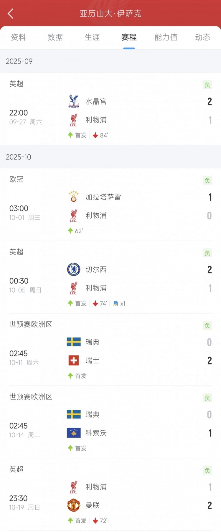 利物浦碰到4连败,而伊萨克本东说念主则碰到各项赛事6连败!其中英超不敌水晶宫、切尔西、曼联,欧冠客负加拉塔萨雷,世初赛代表瑞典队不敌瑞士和科索沃。技艺,伊萨克6场比赛仅在对阵切尔西的比赛中孝顺1次助攻。