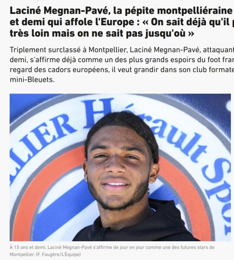 10月22日讯 《队报》音书,巴萨和阿森纳在密切珍贵蒙彼利埃天才时尚拉辛内·默格南-帕维(Laciné Megnan-Pavé)。
