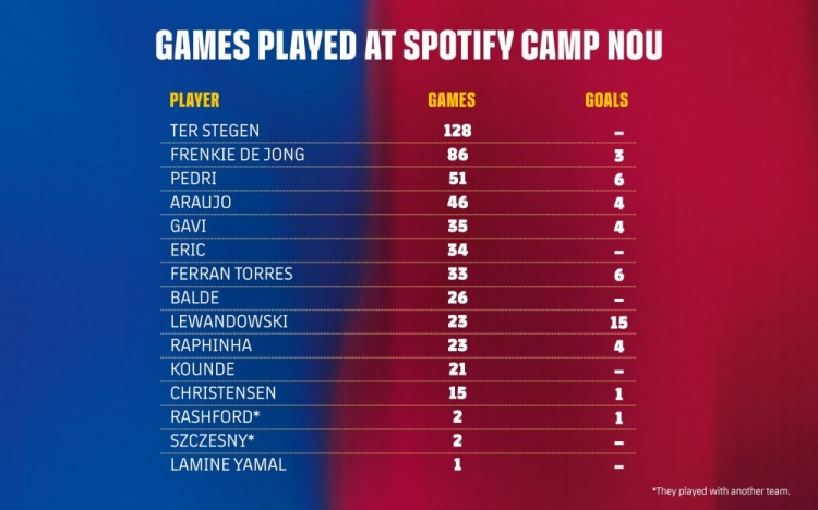 在现时声威中,五位队长中的四位占据了队内诺坎普球场出场次数榜的前哨:特尔施特根、弗兰基·德容、佩德里和阿劳霍。