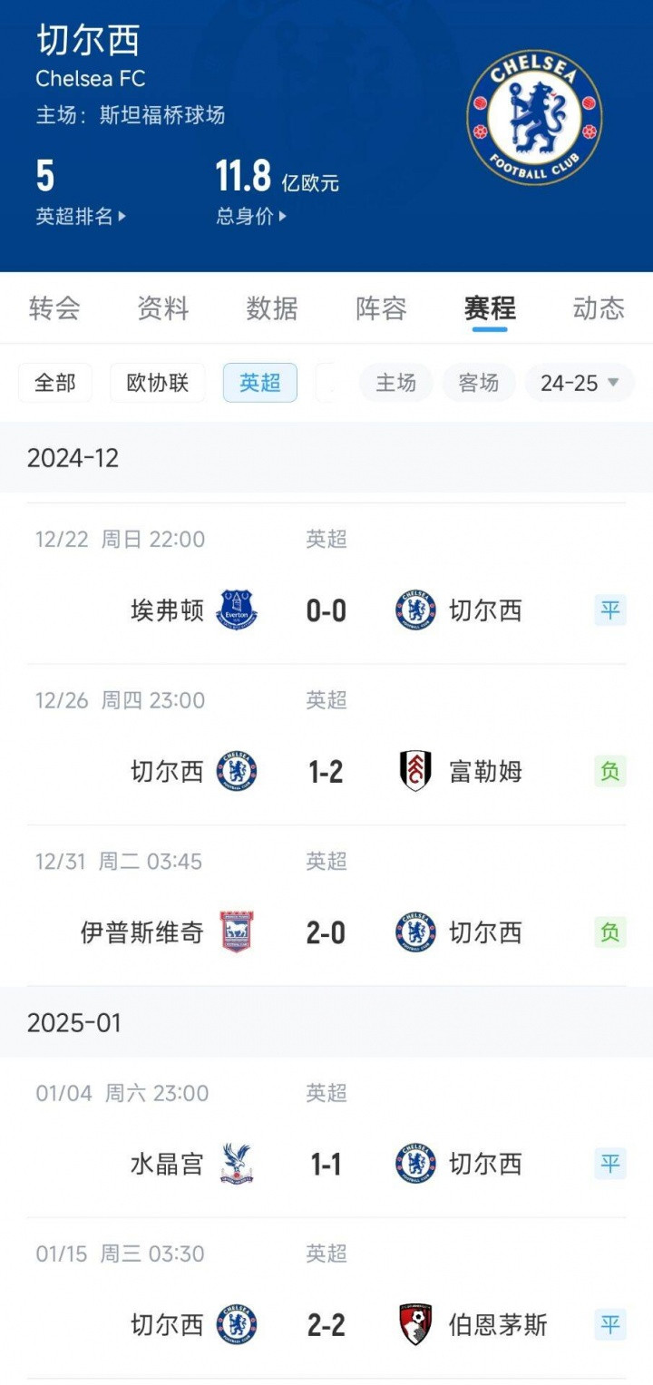 在客岁的12月,切尔西曾经崩盘遇到低谷。24/25赛季的12月底,切尔西接连不堪埃弗顿、富勒姆、伊普斯维奇,加上1月初的2场不堪,切尔西5轮不堪平直崩盘,在其时是平直退出了英超争冠。