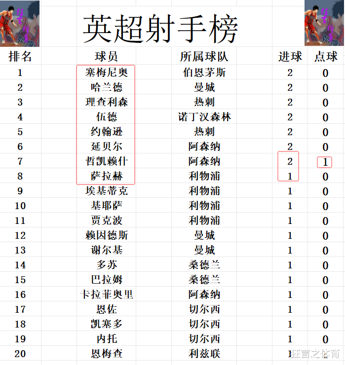 弓手榜方面,哲凯赖什,延贝尔梅开二度,约翰逊连场破门,他们王人追上了哈兰德,塞梅尼奥,伍德和理查利森,7东谈主2球并排榜首。萨拉赫,赖因德斯,卡拉菲奥里,恩佐,凯塞多等王人是1球上榜。