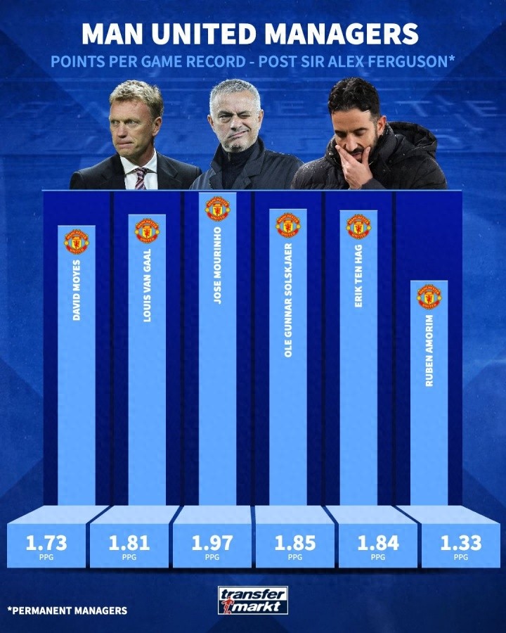 据此前德转统计,穆里尼奥是后弗格森时期场均得分最高的曼联主帅,他以场均1.97分位列第一,而现任主帅阿莫林则以1.33分垫底。