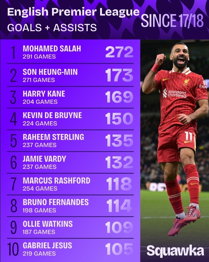 9月9日讯 2017年加盟利物浦以来,萨拉赫在进军端展示出了极高的效果。凭据Squawka的数据统计,埃及边锋共出战291场英超比赛,平直参与272球,同时断层荒谬。
