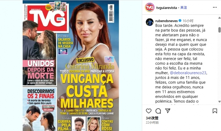 葡媒封面推行:鲁本内维斯、鲁特。在若塔死亡后,迪奥戈-若塔的老婆依靠着最佳的一又友渡过难关。