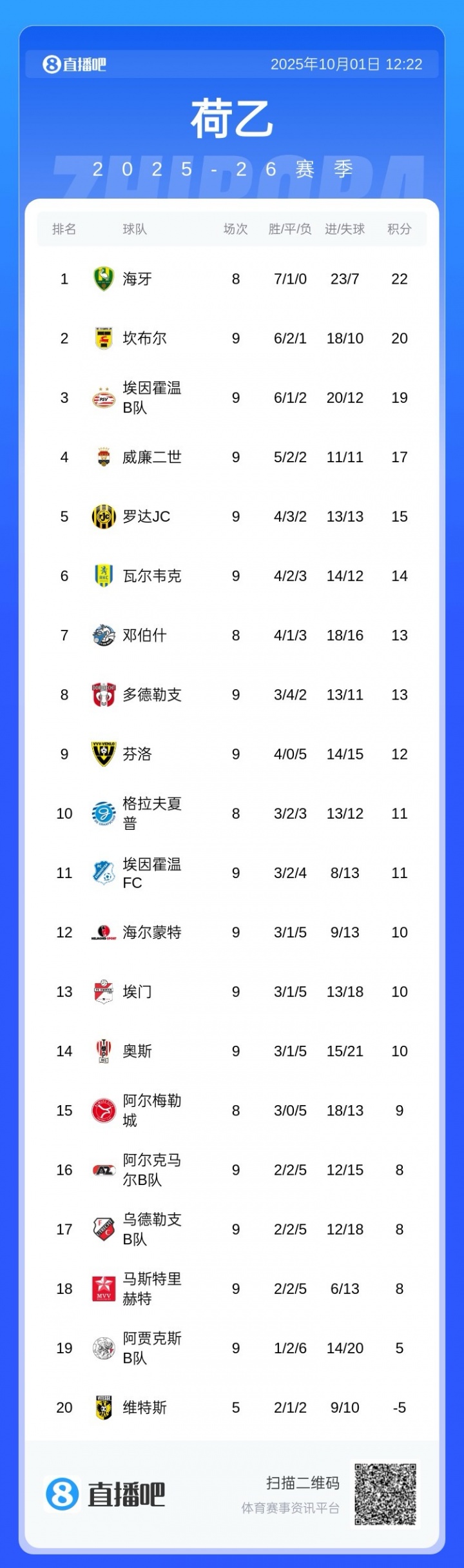 笨重拿分!荷乙维特斯本赛季-12分开局,5轮事后积分为-5分