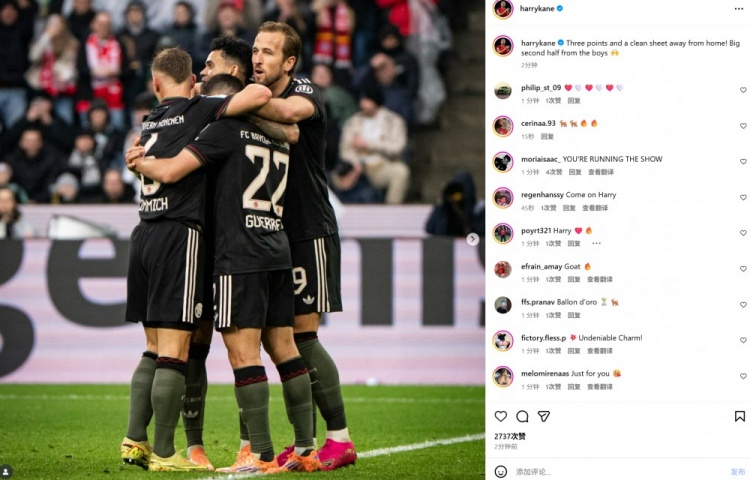 本场比赛凯恩未能破门,贯穿10场进球遭完结。赛后凯恩社媒晒出与队友庆祝相片,配文写说念:“在客场全取三分并完成零封,下半场咱们拿出了精彩进展。”