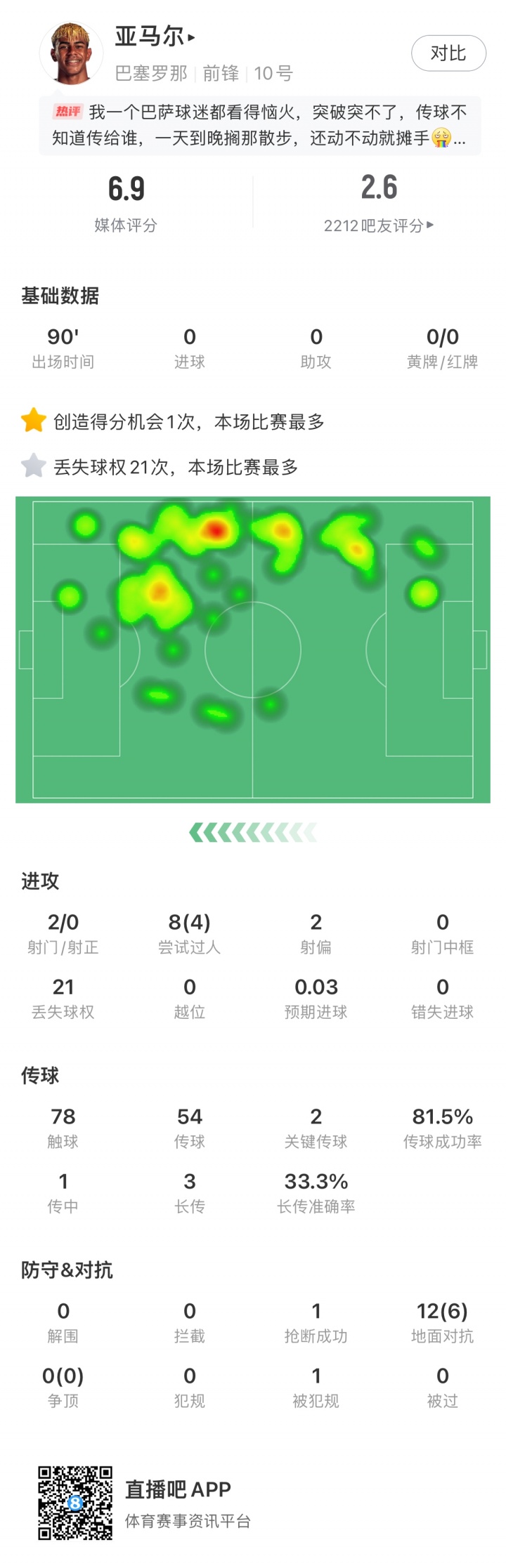 低迷!亚马尔国度德比线路:2射0正,21次丢失球权,媒体评分6.9