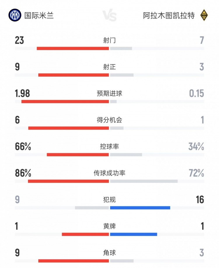 国米vs凯拉特数据:射门23比7、得分契机6比1、控球率66%比34%