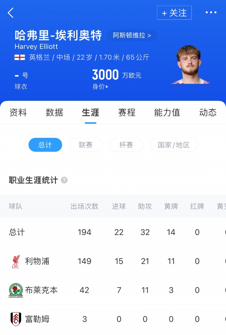 埃利奥特时年22岁,英格兰籍中场。他在16岁被利物浦170万欧从富勒姆青训挖来,于今共为利物浦一线队出场149次,打入15球21助攻。当今其德回身价为3000万欧元。